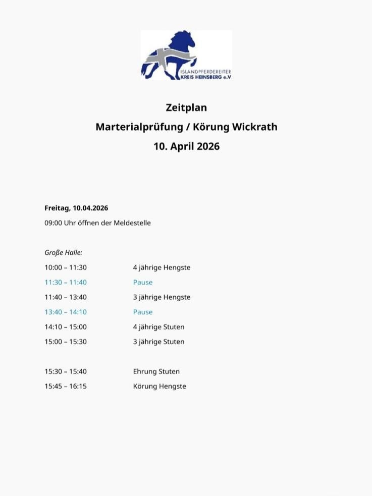 Am 10.04.2026 findet in Wickrath die diesjährige Körung für die Rasse Islandpferde statt. Anbei finden Sie sowohl den Katalog zu den gemeldeten Pferden als auch einen Zeitplan.